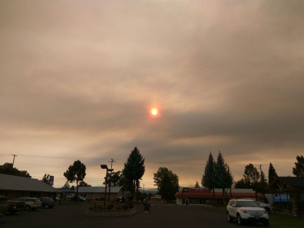 A la mañana siguiente nos enteramos de que había un par de focos de incendio dentro del parque, pero que estaban lejos de nuestro recorrido. Pero al ver el cielo al salir del Motel nos empezamos a dar cuenta de que no debíamos temer las nubes que pudiera haber durante el eclipse, sino el humo.