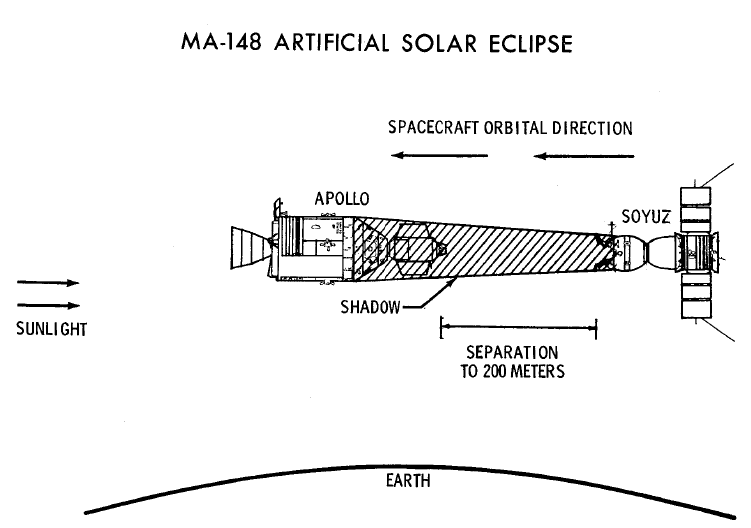 A 225 metros de distancia la nave Apolo abarcaba dos discos solares y Leonov y Kubasov podían entonces fotografiar la corona solar y de este modo hubieran podido realizar las únicas fotografías coronales de 1975 ya que ese año no hubo ningún eclipse solar total.