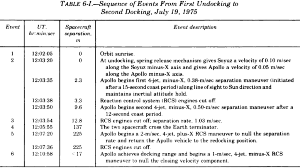 Antes del desacoplado de ambas naves, el conjunto debía orientarse de modo que la gran tobera del SPS apuntara directamente al sol de modo que durante la separación los tres objetos (nave Apolo, nave Soyuz y Sol) estuvieran alineados.