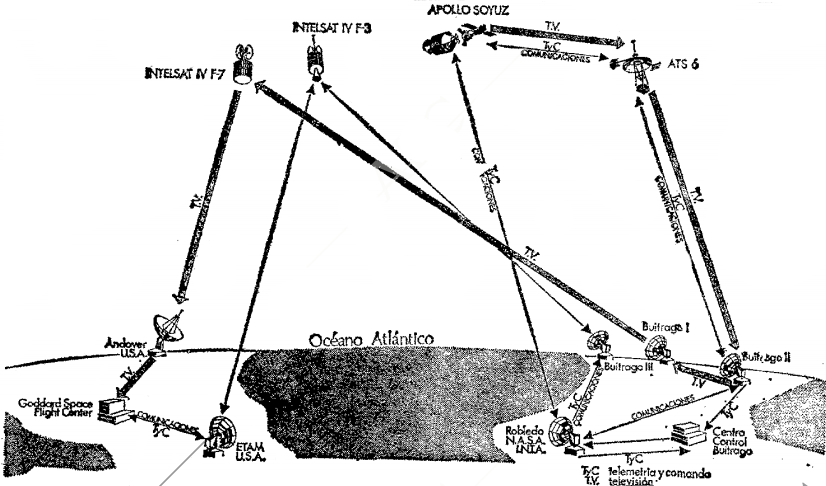 Y de allí se retransmitía hacia el satélite Intelsat IV F-3 para retransmitirlo al otro lado del Atlántico. La señal era recibida en ETAM y de allí por enlaces terrestres, a los edificios 8 y 30 del Centro Espacial Johnson en Houston, Texas.