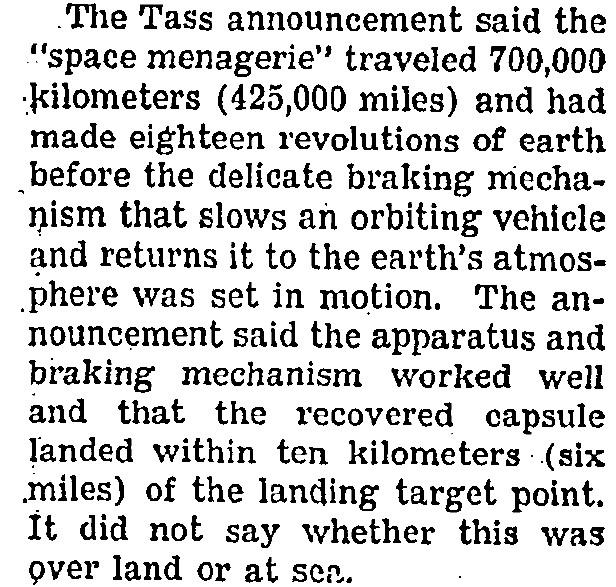 La cápsula fue expulsada en el momento de la explosión pero los dos perros murieron en el desastre. Esta misión fue ocultada por la U.R.S.S. y solo años después pudimos saber de ella.