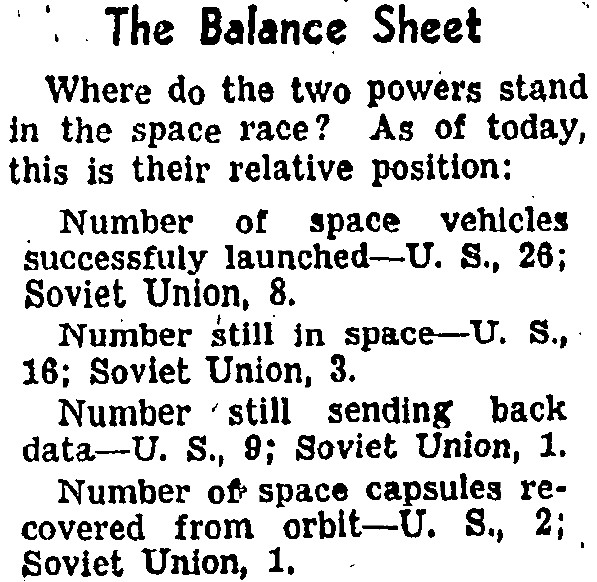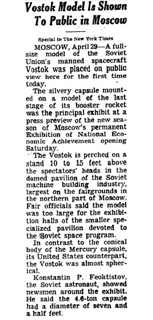 «El Vostok que pesa 300 toneladas es el cohete empleado por los rusos para poner al primer hombre en el espacio hace seis años. El cohete es más poderoso que los primeros lanzadores americanos pero menos que los posteriores Titan, de acuerdo con los expertos de la industria.