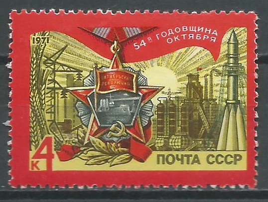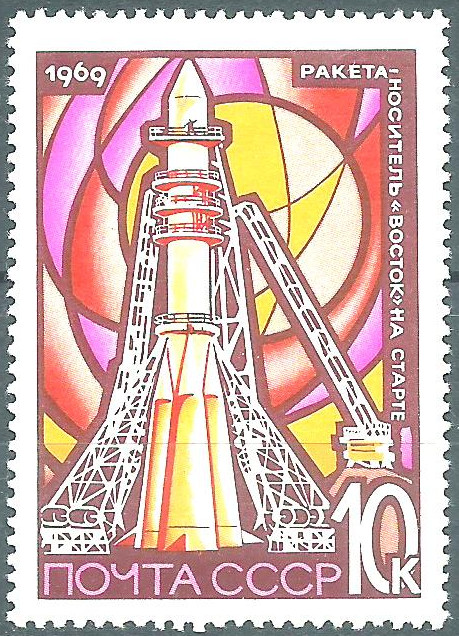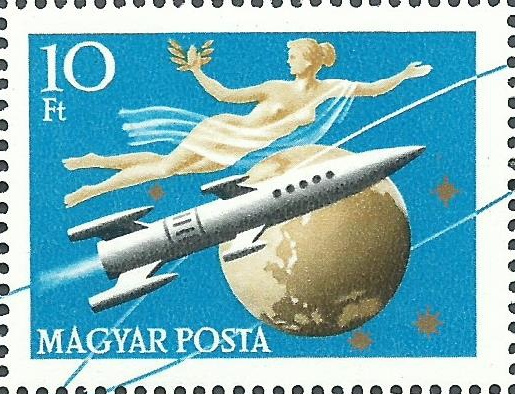 La representación oficial serían estos primeros sellos de la U.R.S.S. Se mantiene el cohete cónico con alas (aunque con dos variantes, una con dos segmentos alados y otra con tres)