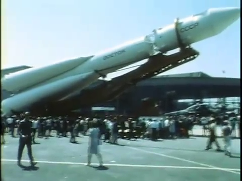 Pero sin duda la estrella del Salón fue el otrora poderoso cohete R-7 Semiorka. Los occidentales quedaron muy sorprendidos de la cantidad de toberas y de la configuración con cuatro etapas laterales (las que forman durante el despegue la famosa cruz de Koroliov al separarse de la etapa central)