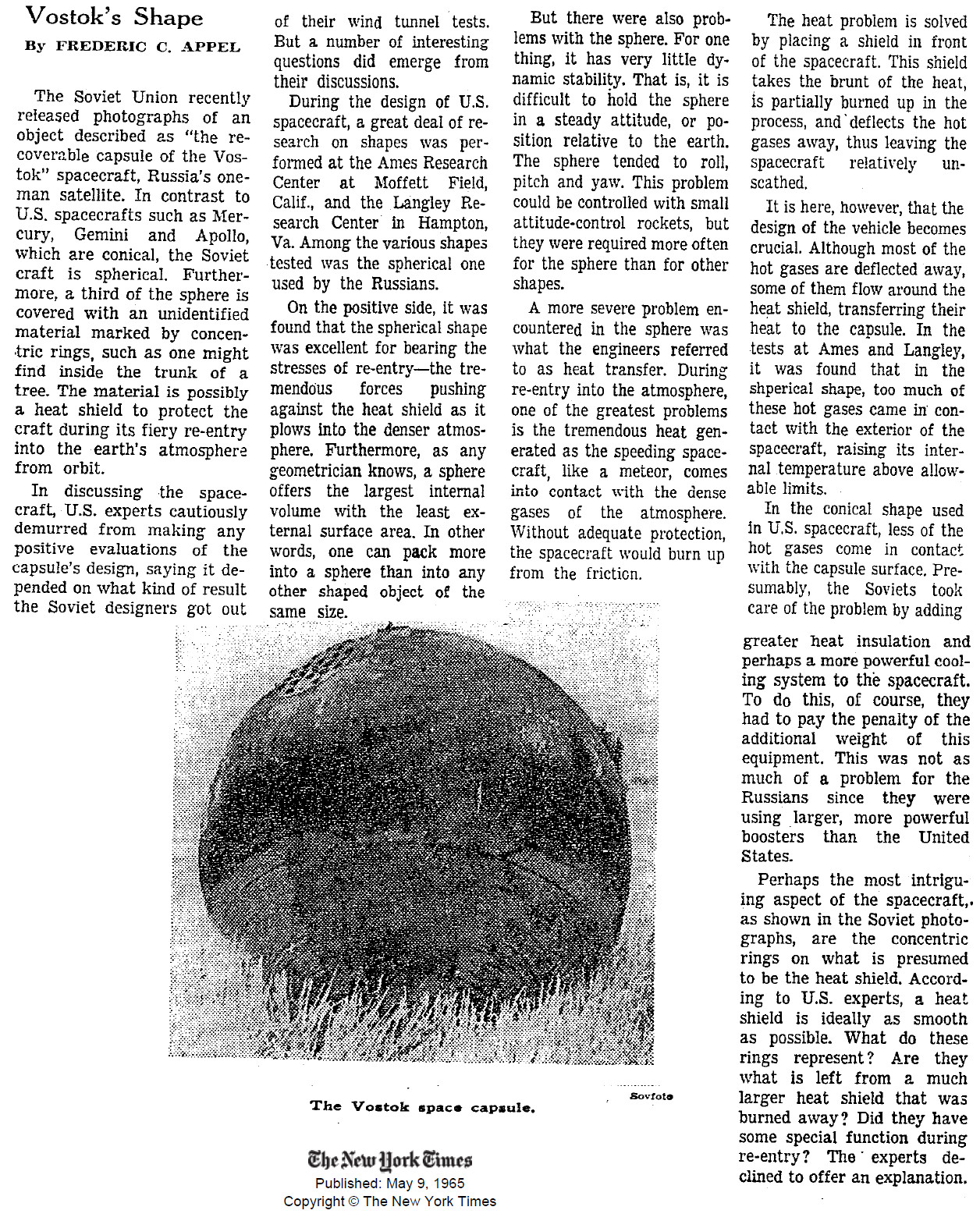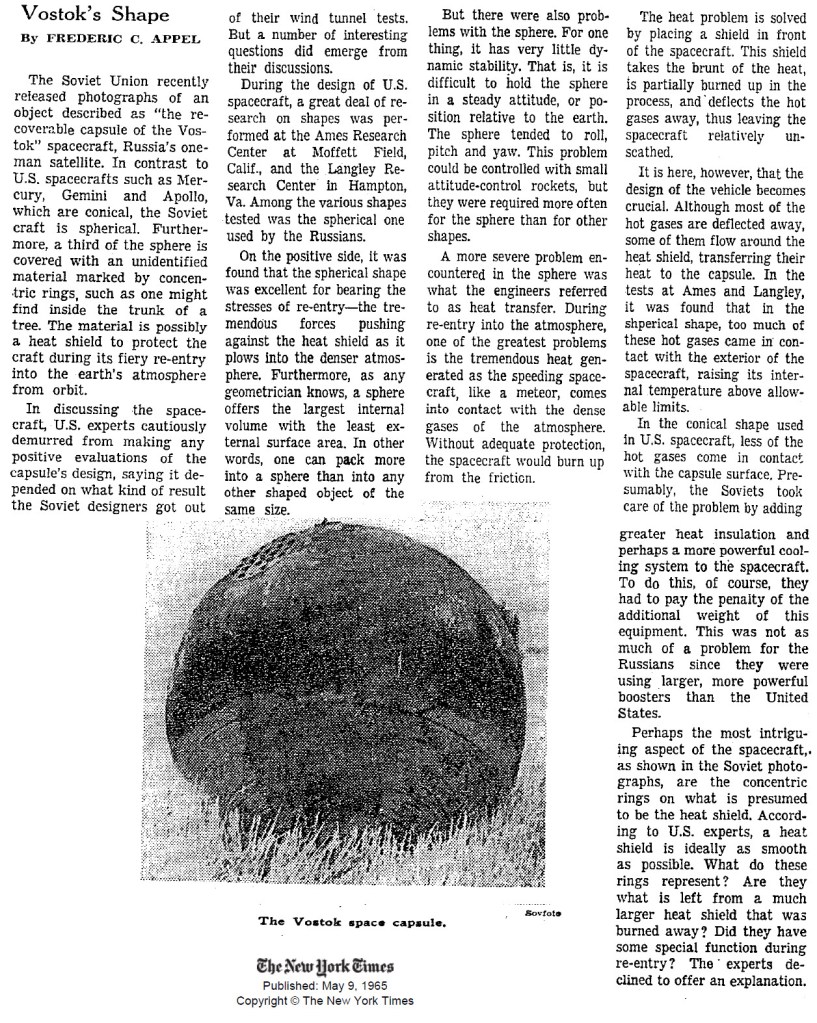 «Los expertos estadounidenses en misiles afirmaron no estar impresionados con el lanzador Vostok al descubrir que era propulsado por un grupo de cinco cohetes y no por una enorme motor de energía desconocida en Occidente. Es, en términos de la era espacial, bastante antiguo y poco sofisticado, pero sin embargo, extraordinariamente poderoso».