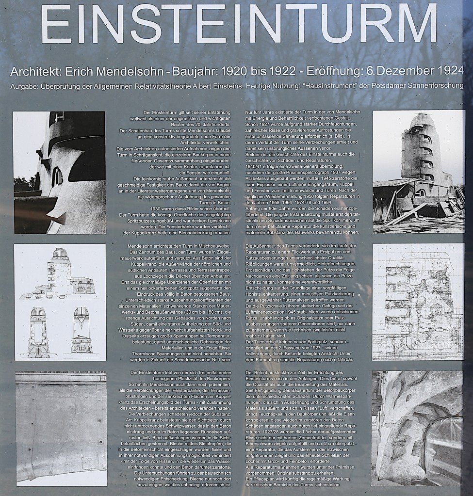 El proyecto arquitectónico fue encomendado a Erich Mendelsohn que presentó los planos de un edificio extraordinario: Una torre de 14 metros en un edificio sinuoso (digno de haber figurado en la película expresionista cumbre de la ciencia ficción alemana Metropolis) donde, al igual que en la teoría de Einstein, predominaban las curvas sobre las líneas rectas. Podemos decir que es el primer edificio relativista.