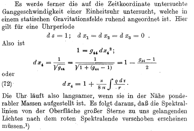 «Por lo tanto, el reloj va más lento cuando se coloca en la vecindad de masas gravitatorias. De esto se deduce que las líneas espectrales en la luz que nos llegan de las superficies de las grandes estrellas debe aparecer desplazado hacia el extremo rojo del espectro.»