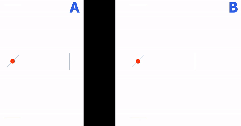 Si Galileo tenía razón, B era lo que cabría esperar en el detector (lo que realmente se observa en el detector son patrones de interferencia de luz, algo que queda fuera del objetivo de esta explicación).
