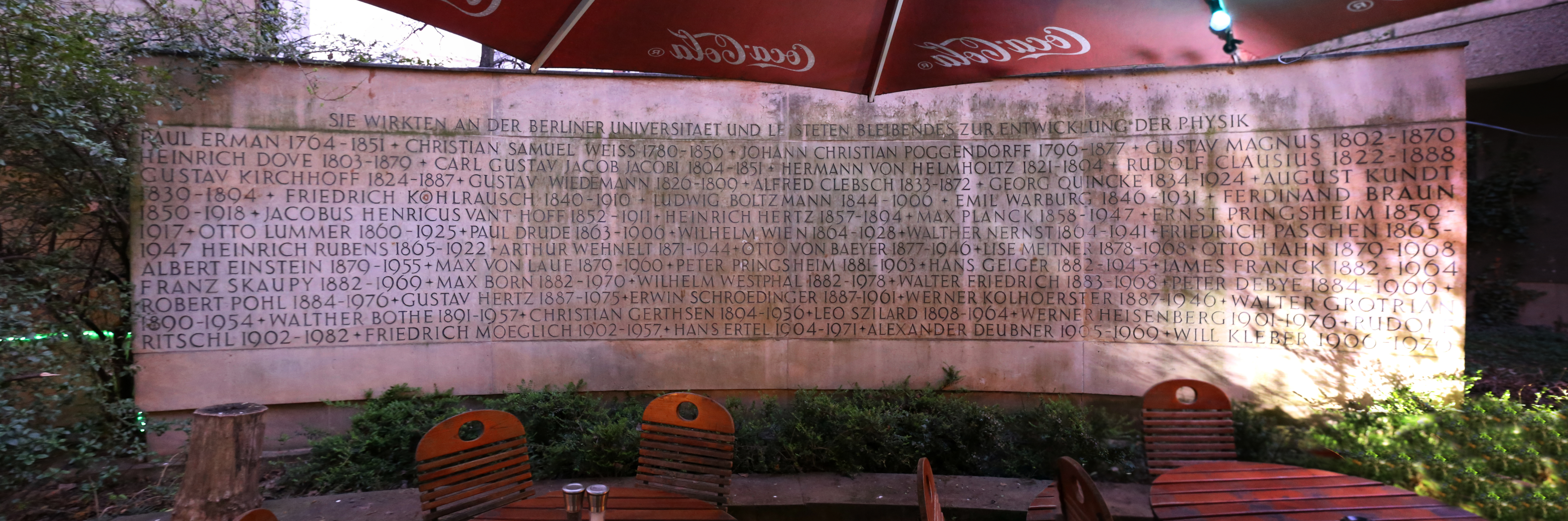 El muro con los nombres y fechas de nacimiento de físicos y físicas que han aportado su conocimiento desde las Universidades de Berlín.