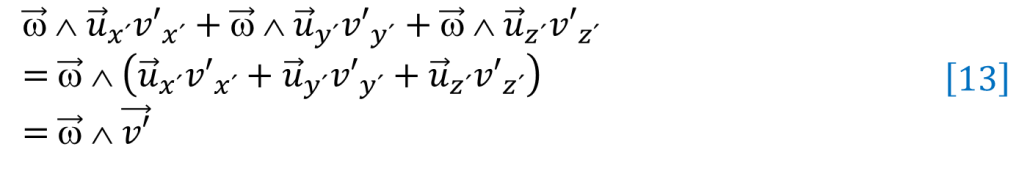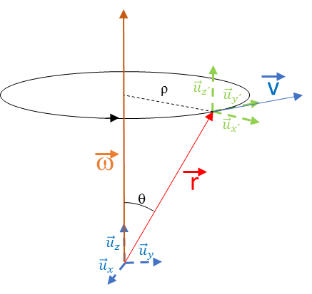 En la figura anterior podemos ver que el vector r (origen del Sistema de referencia O’ que gira respecto al O) gira alrededor del eje uz con una velocidad angular ω. La velocidad v viene dada por el producto vectorial de los dos vectores, ω y r.