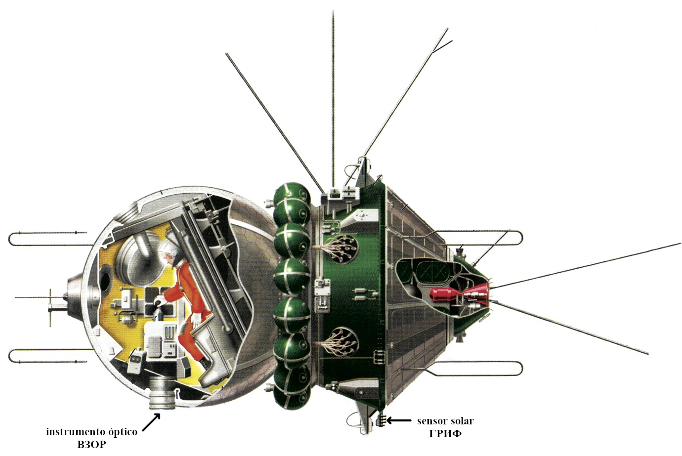 La antena 2 del gráfico es una cesión a los cosmonautas. Servía para recibir las señales de radiodifusión de Tierra. Vamos, la radio pública (en la URSS no había radios privadas). Me imagino a Valentina escuchando la versión orquestada de la Internacional que emitía Radio Moscú para escucharse a este lado de los Pirineos…