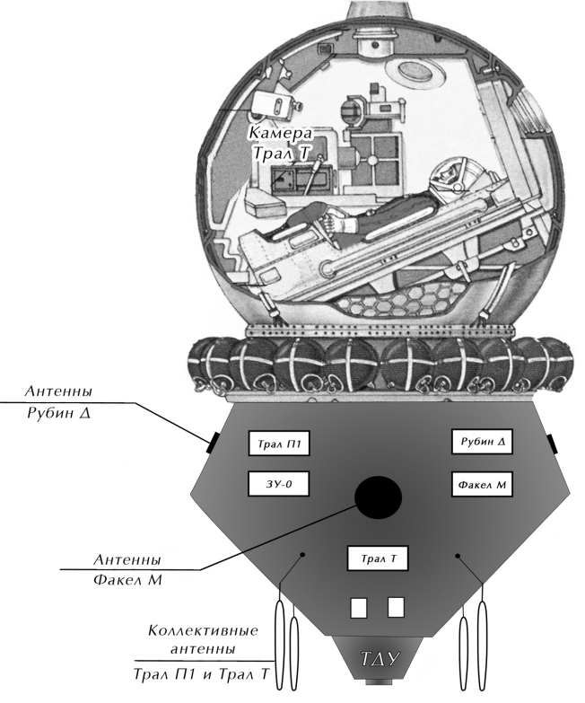 - Sistema Трал: Telemetría y señal de televisión del interior de la nave.