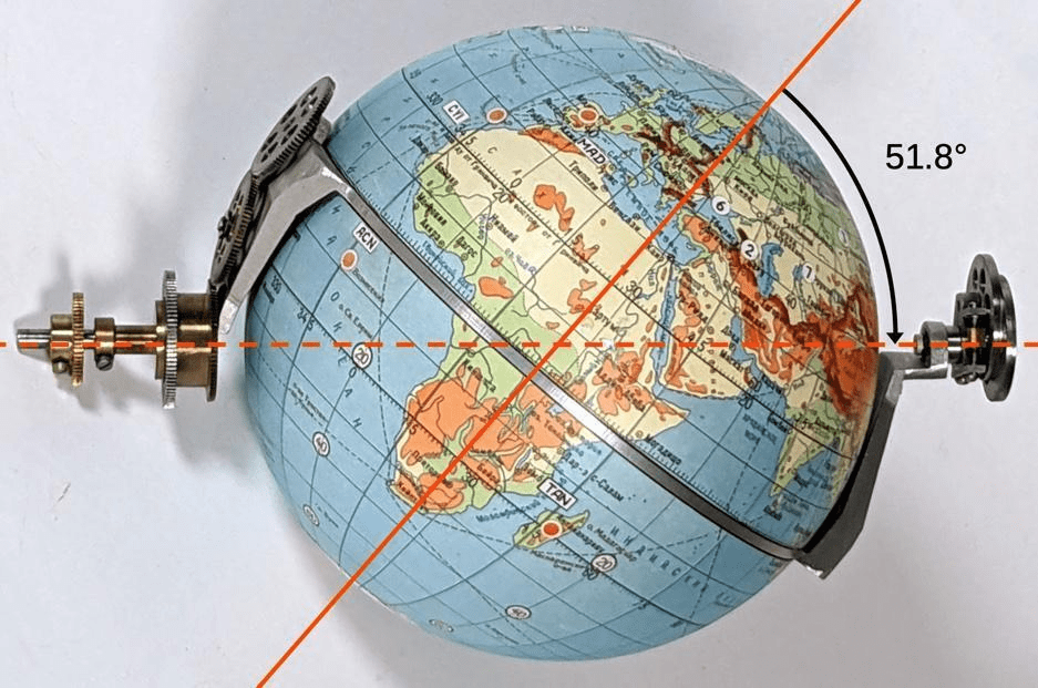 El eje principal que sujeta todo el dispositivo tiene una inclinación respecto al eje polar de la Tierra de 51.8º. Solidario con la estructura hay un aro metálico que representa el ecuador y dentro de él el globo terrestre tiene otro eje que permite girar la bola desde su interior. De este modo podemos girar en dos ejes ortogonales.