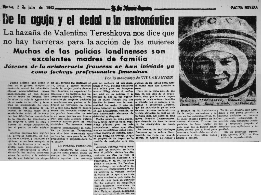 No voy a poner más portadas pero sí voy a mostraros que en aquella época en España, lo de que una mujer realizara acciones tradicionalmente «masculinas» chocaba con el pensar general (aunque la tradición en el tema astronáutico en 1963 era bastante corta).