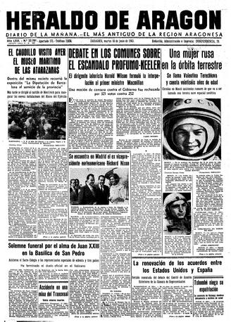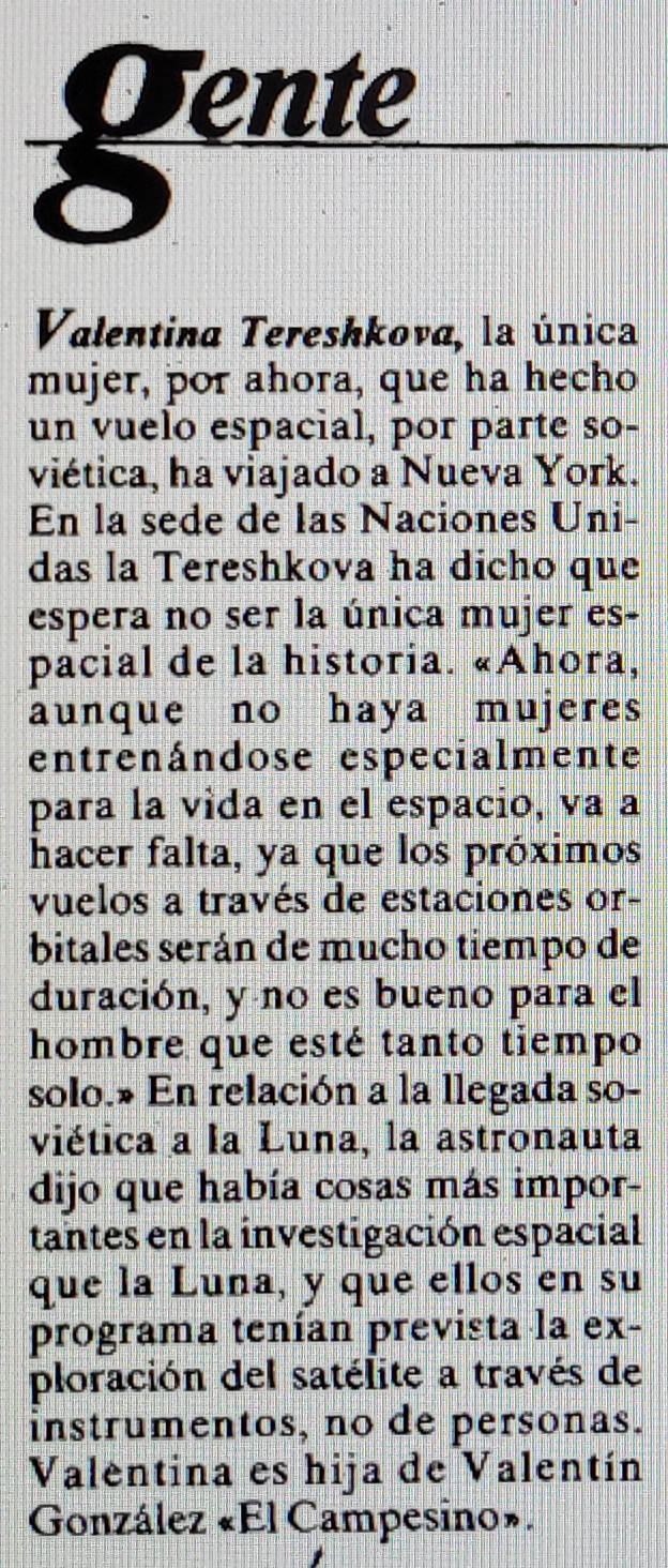 El periódico de mi tierra, el «Heraldo de Aragón» sí tuvo a bien llevar a primera página a la primera mujer cosmonauta. Durante muchos años este periódico fue mi principal fuente de noticias astronáuticas que conservo en varios cuadernos con mucho mimo.