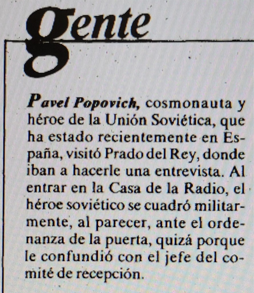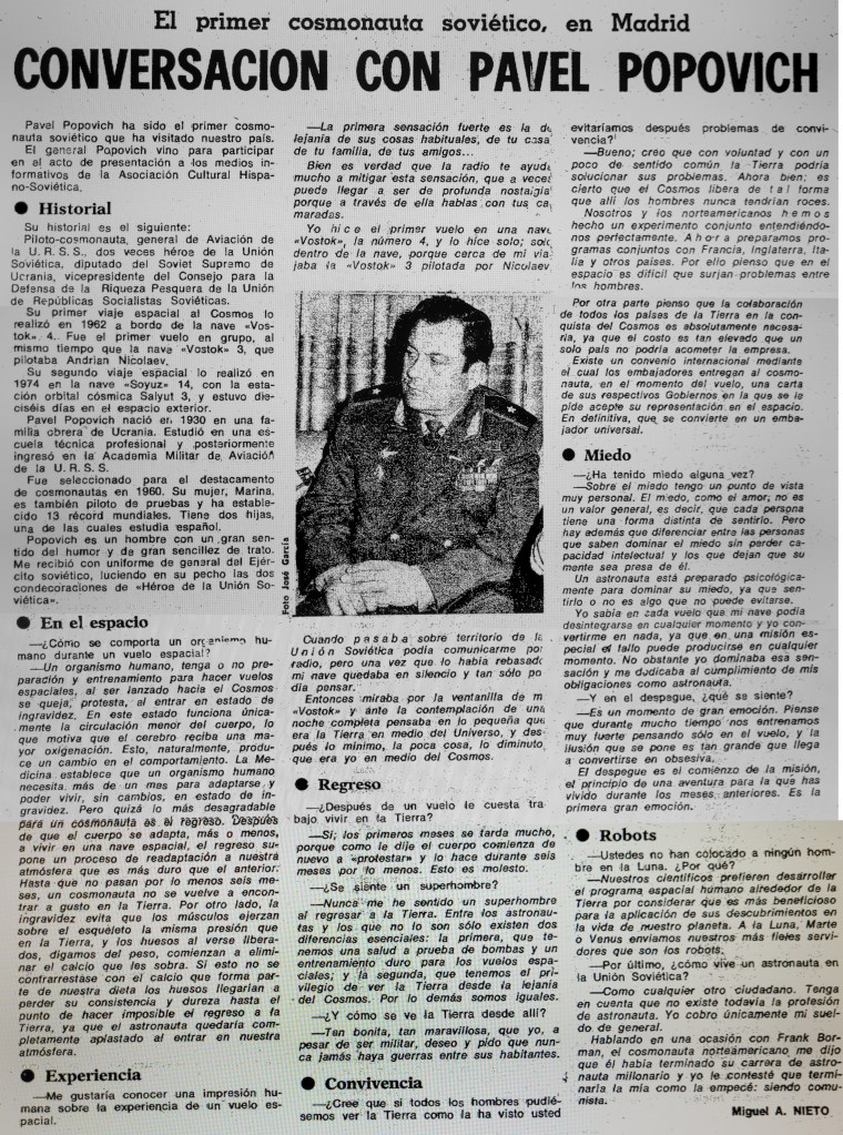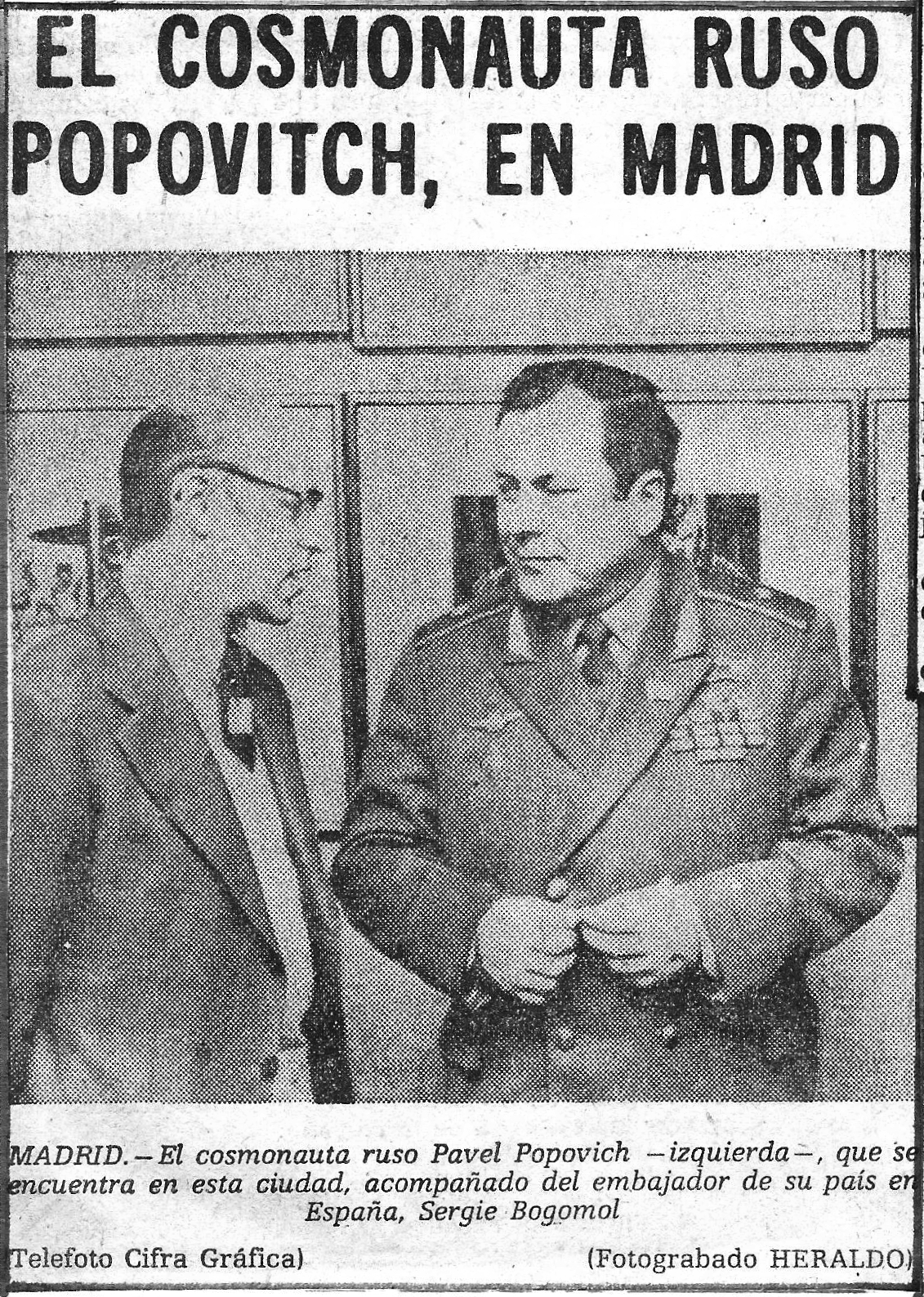 El primer cosmonauta que visitó España fue el risueño ucraniano Pavel Popovich. Estuvo en España en Noviembre de 1977 (antes de las primeras elecciones democráticas en España).