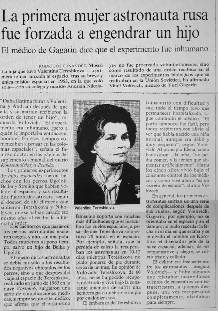 Valentina, por unos días, regresó a la prensa española. Y lo hizo por uno de los hechos más oscuros del programa Vostok y que se insinué al final del segundo capítulo, «Она, Валентина» («Ella, Valentina»), de esta serie de entradas.