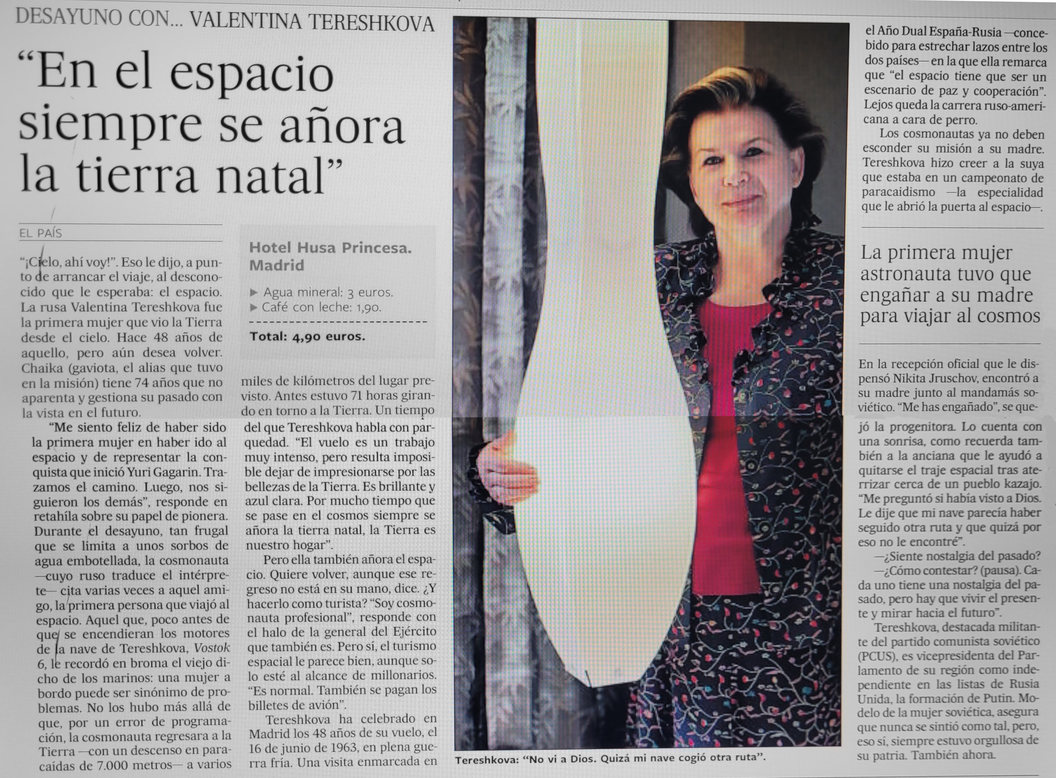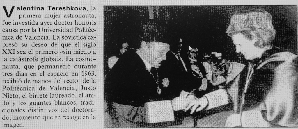 En el año 1991 Valentina Tereshkova visitó España por primera vez. Su traslado a España estuvo originado por la concesión del título Dr. Honoris Causa por la Universidad Politécnica de Valencia. No era la primera visita a España de un cosmonauta del programa Vostok… 1