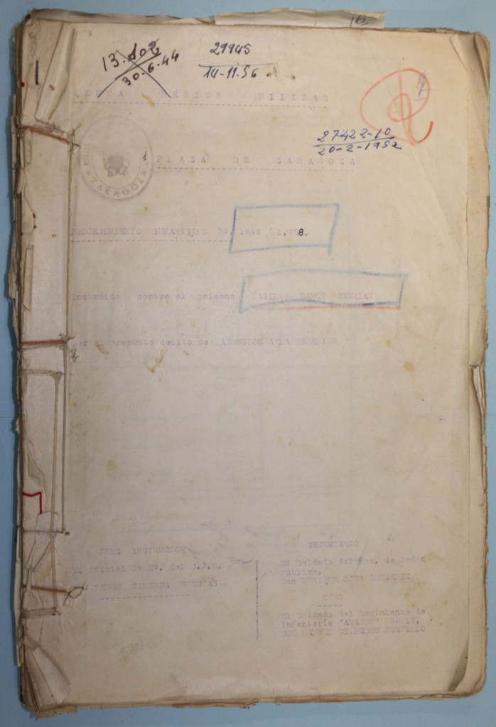 Al expresado Basilio le fue fusilado el padre y tiene tres hermanos huidos desde los primeros momentos del Movimiento Nacional a zona roja y otro hermano en la cárcel de Calatayud y una hermana que reside en esta Capital también es libertaria destacada.