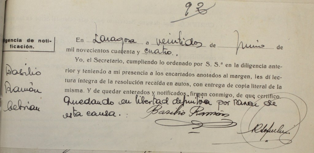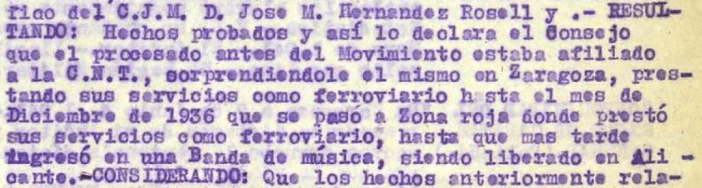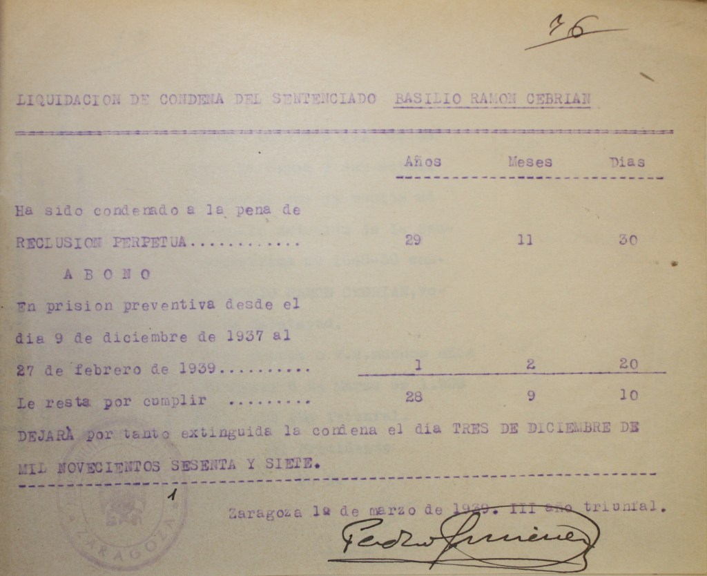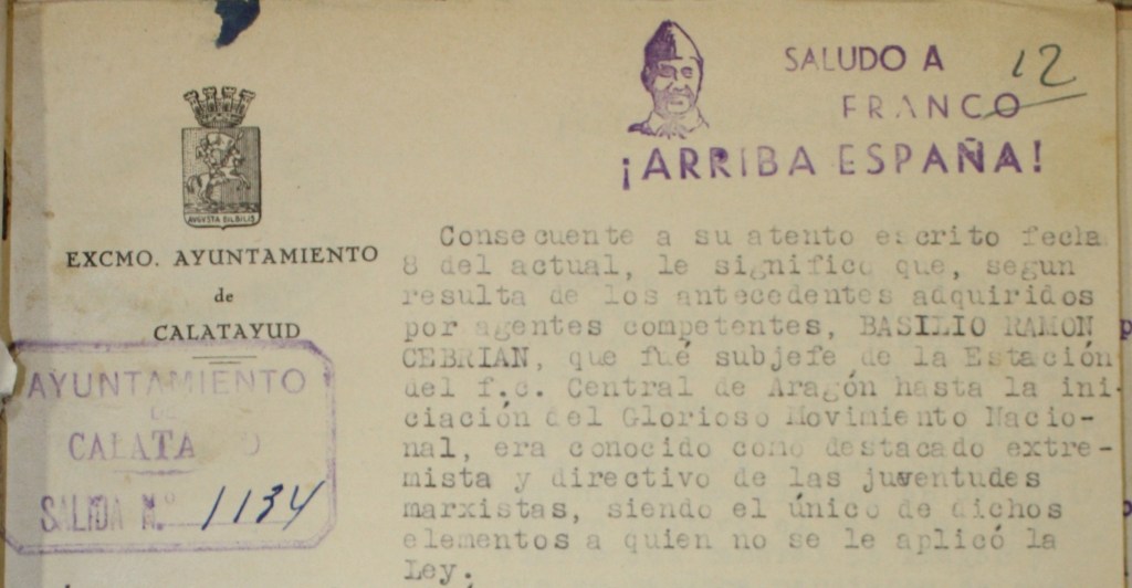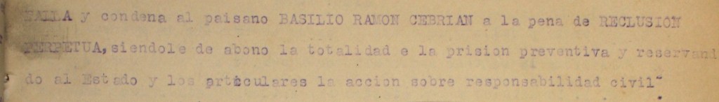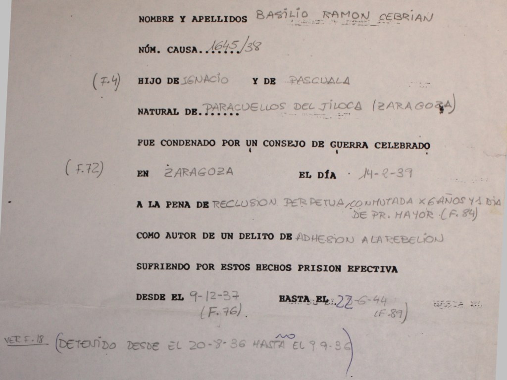 […] sobre la actuación de BASILIO RAMON CEBRIAN, no existen datos concretos acerca de la misma así como de las personas que puedan atestiguarlo, algunas de las cuales, por ser significados extremistas, se les aplico la ley.