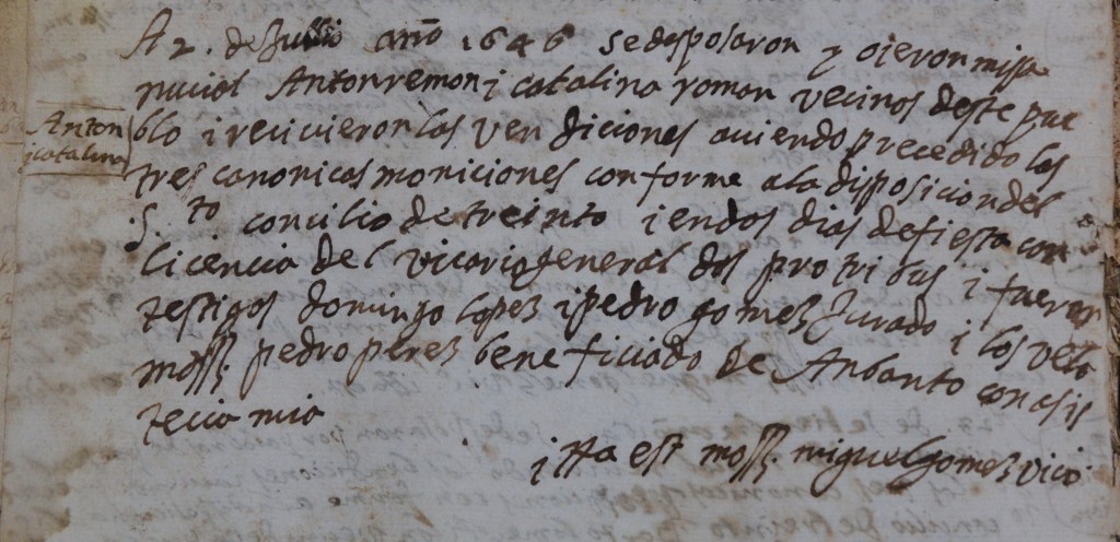 A 2 de Julio año 1646 se desposaron y oieron misa nucial Anton Remon i Catalina Roman vecinos deste pueblo i recivieron las vendiciones aviendo precedido las tres canonicas moniciones conforme a la disposicion del Santo concilio de trento i en dos dias de fiesta con licencia del vicario general ¿dos pro tui das? i fueron testigos domingo lopez i pedro gomez Jurado i los vemos Mossen pedro perez beneficiado de Anbanto con ofistecio mio