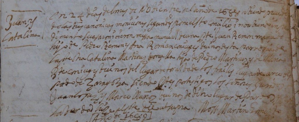 En 24 días del mes de Nobienbre del año 1688 abiendo precedido las tres canónicas monciones segun las pone el Santo Concilio i no abiendo impedimento se casaron i oieron misa nupcial de una este Juan Ramon mancebo hijo de Pedro Ramon y Ana Roman conyuges y vecinos de esta parroquia de la otra parte otra Catalina Martínez doncella hija de Pedro Martínez y de María (?) conyuges y vecinos del lugar de Torralba de los frailes lugar de arcos (?) de Zaragoza siendo por testigos los señores Jurados Juan Lopez y Marco Muñoz vecinos de dicho lugar de Pardos y la verdad dije