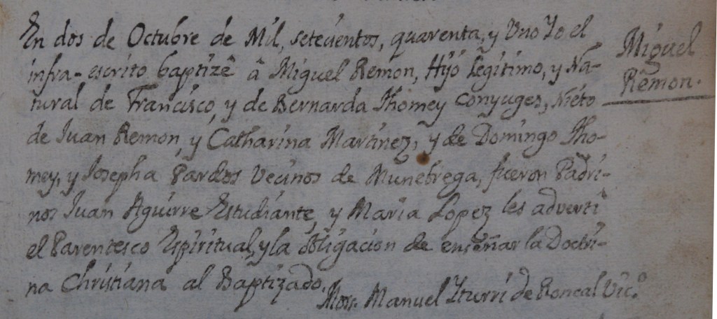 En dos de Octubre de Mil setecientos quarenta y uno Yo el infra-escrito baptizé a Miguel Ramón, Hijo Legítimo, y natural de Francisco, y de Bernarda Thomey conyuges, Nieto de Juan Ramon y Catharina Martínez, y de Domingo Thomey y Josepha Pardos vecinos de Munebrega, fueron Padrinos Juan Aguirre Estudiante, y María Lopez les advertí el Parentesco Espiritual y la obligacion de enseñar la Doctrina Cristiana al Baptizado.