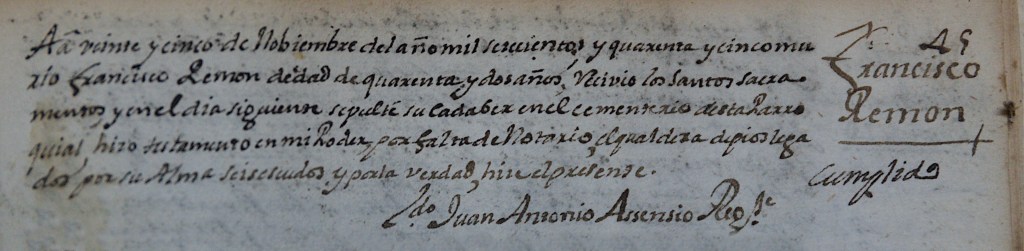A veinte y cinco de Nobiembre del año mil setecientos y quarenta y cinco murio Francisco Ramon de’dad de quarenta y dos años. Recivio los Santos sacramentos y en el dia siguiente sepulté su cadaber en el cementerio desta Parroquia, hizo testamento en mi Poder por falta de Notario el qual dexa de pios legados por su Alma seis escudos, y por la verdad, hice el presente.