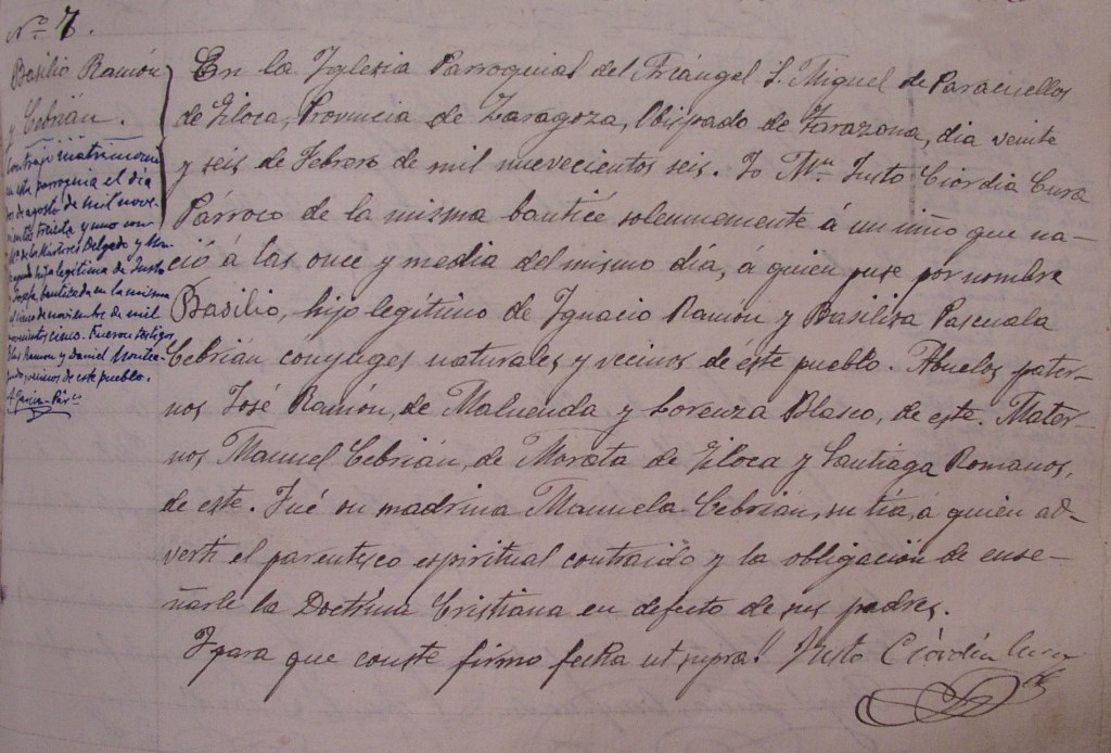 En la Iglesia Parroquial del Arcángel de San Miguel de Paracuellos de Jiloca, Provincia de Zaragoza, Obispado de Tarazona, día veinte y seis de Febrero de mil nuevecientos seis, Yo Mosen Justo Ciordia Cura Párroco de la misma bauticé solemnemente a un niño que nació a las once y media del mismo día, a quien puse por nombre Basilio, hijo legítimo de Ignacio Ramón y Basilisa Pascuala Cebrián conyuges naturales y vecinos de este pueblo. Abuelos paternos José Ramón de Maluenda y Lorenza Blasco, de este. Maternos Manuel Cebrián de Morata de Jiloca y Santiaga Romanos de este. Fue su madrina Manuela Cebrián, su tía, a quien advertí el parentesco espiritual contraido y la obligación de enseñar la Doctrina Cristiana en defecto de sus padres.