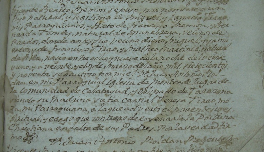 Vicente Benito Ramón se puso por nombre a un hijo natural y legítimo de Miguel y Ignacia Tizao, mis Parroquianos, y nieto de Francisco Ramón y Bernarda Tomey, natural de Munébrega, vecinos de Pardos, donde antes fue vecino dicho Miguel, y ya muertos, y de Francisco Tizao y Mathea Martínez, natural de Ateca, nació entre ocho y nueve de la noche del veinte y uno y a veinte y dos de Marzo del año mil sietecenientos y noventa se bautizó por mi Mosen D. Juan Antonio Roldán en mi Parroquial Iglesia de Monterde lugar de la comunidad de Calatayud, y Obispado de Tarazona siendo su madrina su tía carnal Teresa Tizao, moza mi Parroquiana, a la que advertí el parentesco espiritual y cargo que contraxo de enseñarle la Doctrina Christiana en falta de sus padres. Por la verdad firmo