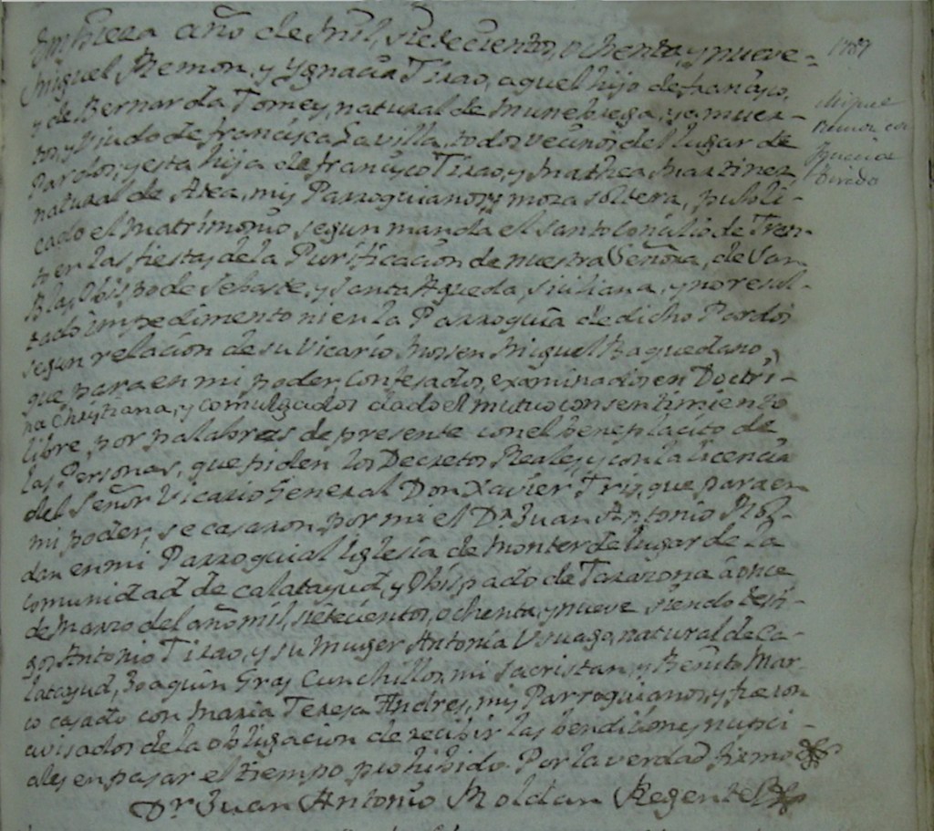 Miguel Ramón y Ignacia Tizao, aquel hijo de Francisco y de Bernarda Tomey, natural de Munébrega, ya muertos y viudo de Francisca Savilla, todos vecinos del lugar de Pardos; y esta hija de Francisco Tizao y Francisca Martínez natural de Ateca, mis Parroquianos y moza soltera, publicado el matrimonio según manda el santo concilio de Trento en las fiestas de la Purificación de nuestra Señora, de San Blas Obispo de Sebaste y Santa Agueda Siciliana, y no resultado impedimento ni en la Parroquia de dicho Pardos según relación de su Vicario Mosen Miguel Baquedano, que para mi poder confesados, examinados en doctrina Christiana, y comulgados dado el mutuo consentimiento libre, por palabras de presente con el beneplácito de las Personas, que piden los Decretos Reales y con la licencia del Señor Vicario General Don Xavier Tris, que para en mi poder, se casaron por mi Mosen D. Juan Antonio Roldan en mi Parroquial Iglesia de Monterde lugar de la comunidad de Calatayud, u Obispado de Tarazona once de marzo del año mil sietecientos ochenta y nueve siendo testigos Antonio Tizao y su mujer Antonia Vinuesa natural de Calatayud, Joaquín Gray Cunchillos mi sacristán y Benito Marco casado con María Teresa Andrés, mis Parroquianos y fueron avisados de la obligación de recibir las bendiciones nupciales en pasar el tiempo prohibido. Por la verdad firmo
