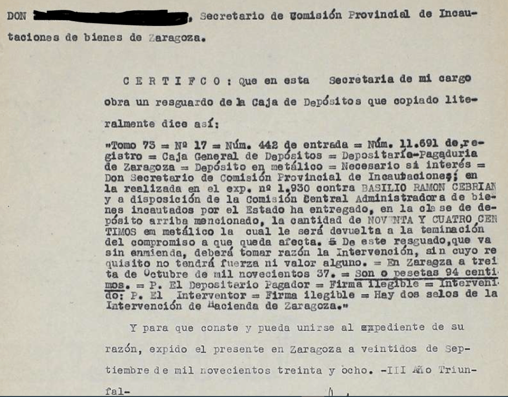 Pero es que también hubo responsabilidades económicas que se iniciaron en la comisión Provincial de Incautaciones de Zaragoza (Expediente número 1930 cuya incoación se inició el 21 de Junio de 1937).