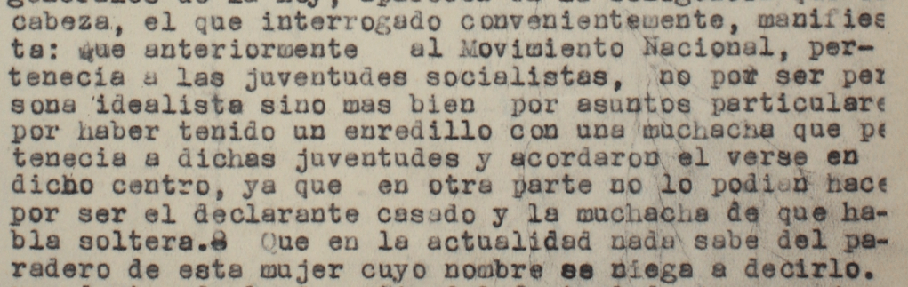 Mi abuelo se declara perteneciente a las Juventudes socialistas pero no por ser idealista sino por asuntos particulares, por haber tenido «un enredillo» con una muchacha, cuyo nombre no declara, que pertenecía a dichas juventudes con la que acordó verse en el centro por ser en el único sitio que podían hacerlo por ser ella soltera y él casado.