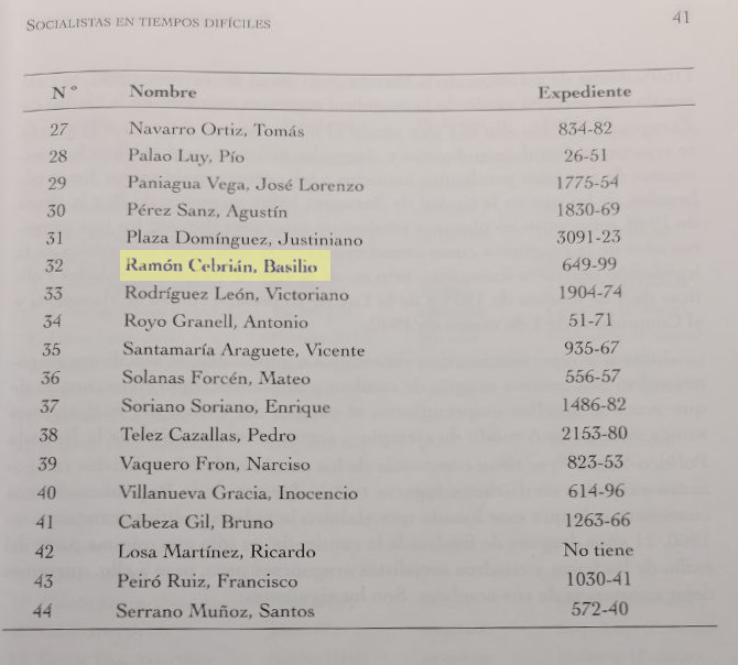 En la página 41 del libro viene una lista de miembros del PSOE que fueron condenados a pena de muerte o mas de 30 años. En la posición número 32 se nombra a Basilio Ramón Cebrián y su expediente político 649-99.