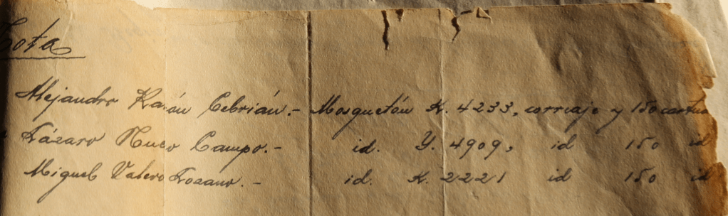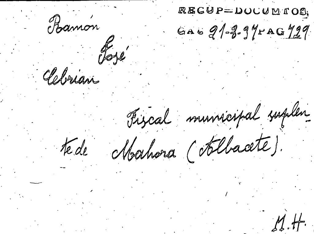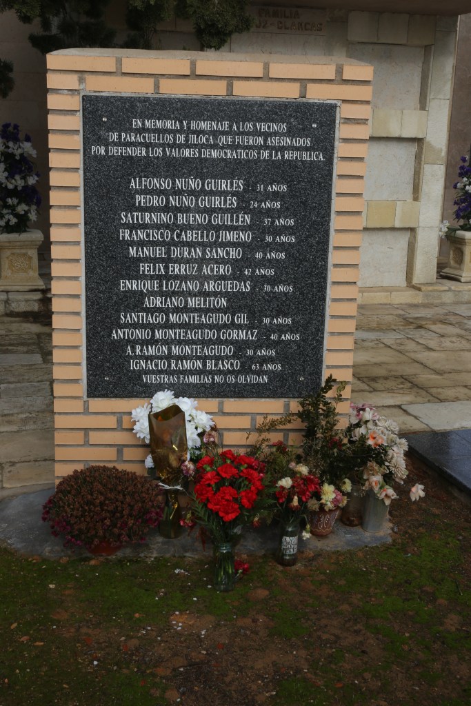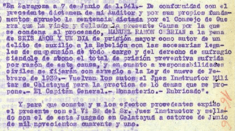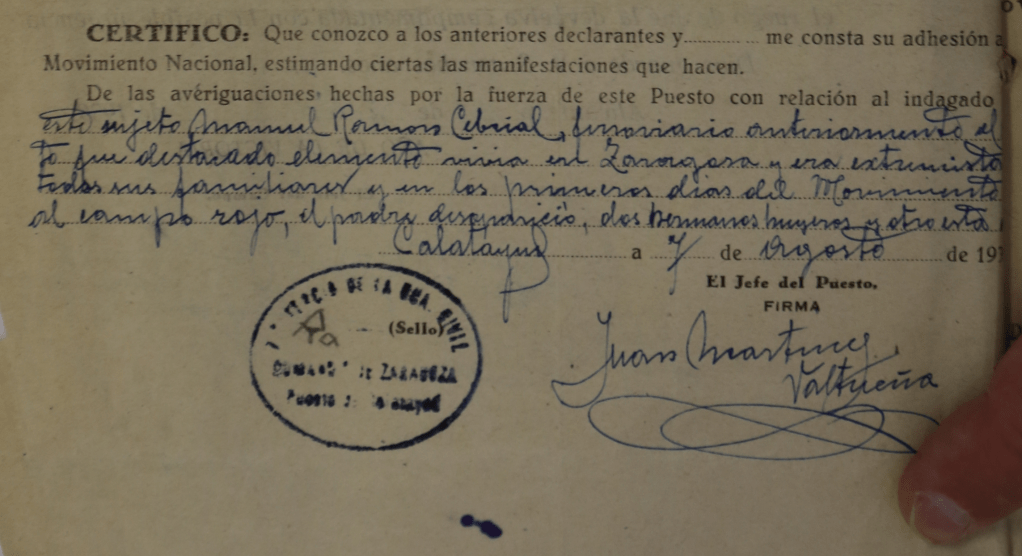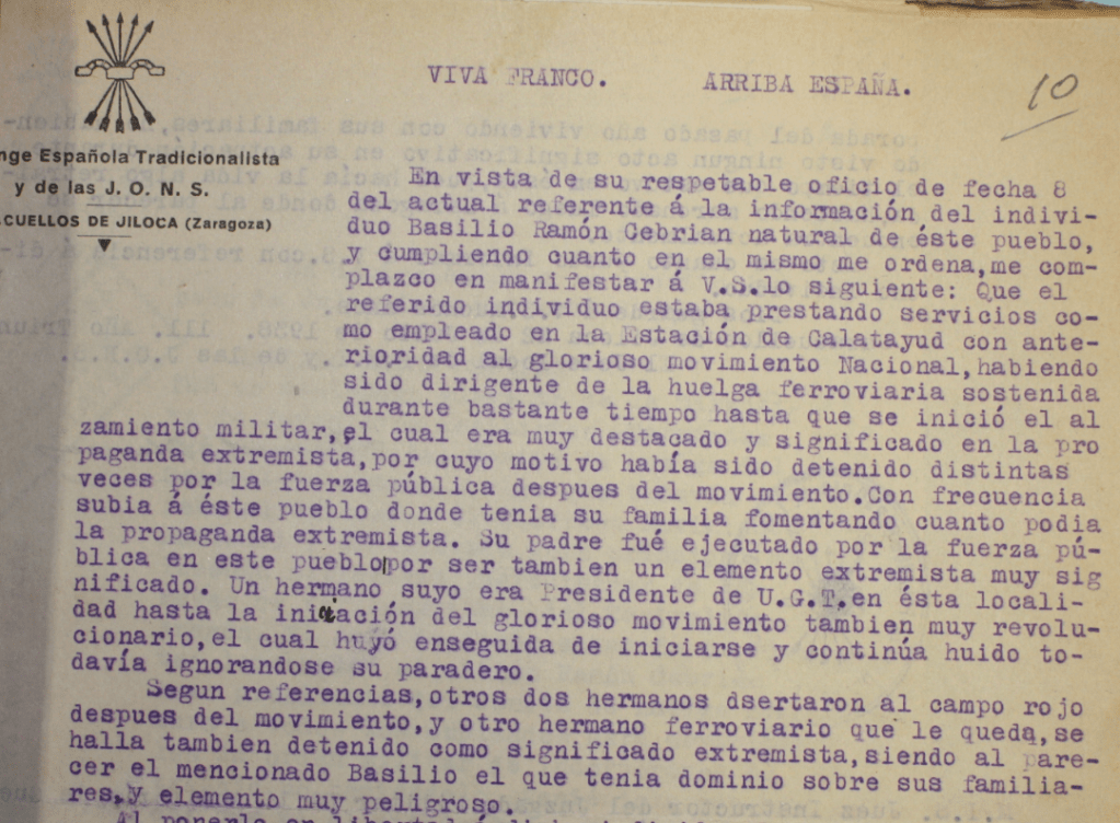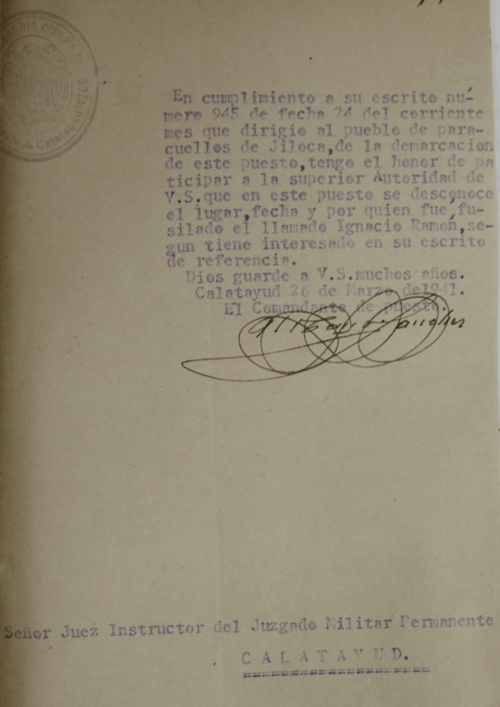 […] Con frecuencia (mi abuelo) subía a este pueblo donde tenía su familia fomentando cuando podía la propaganda extremista. Su padre (Ignacio, mi bisabuelo) fue ejecutado por la fuerza pública en este pueblo (Paracuellos de Jiloca) por ser también un elemento extremista muy significado. Un hermano suyo era Presidente de U.G.T. en esta localidad hasta la iniciación del glorioso Movimiento también muy revolucionario, el cual huyó enseguida de iniciarse y continúa huido todavía ignorándose su paradero.