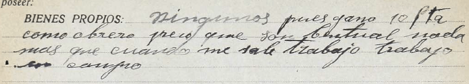 […] es de muy mala conducta y antecedentes, pertenecía a las Juventudes Leninistas marxistas […] en su popio domicilio celebraba frecuentes reuniones con los obreros que capitaneaba […] al frente de un grupo de huelgistas, con azadones, intento parcelar una finca inmediata a los depósitos (de la estación) […] con qué autorización hacía aquello: «Aquello lo hacía porque el terreno era de los obreros y tenía derecho a repartirlo» […] aquello tenía que arreglarse con dinamita […].