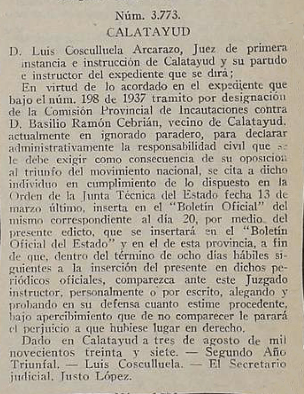 En el Boletín Oficial de la Provincia de Zaragoza (número 187 ) de fecha 10 de Agosto de 1937, en la página 437 puede verse en la Sección Séptima la siguiente entrada