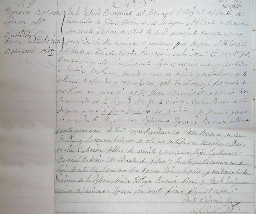En la Iglesia Parroquial del Arcangel S. Miguel del pueblo de Paracuellos de Jiloca, Provincia de Zaragoza, Obispado de Tarazona, día veinte y nueve de Abril de mil ochocientos noventa y nueve, precedidas las tres canónicas moniciones que dispone el St. Concilio de Trento, publicado en esta Parroquia en la Dom. …. ni resuelto impedimento alguno, examinados y aprobados en Doctrina Cristiana, pasadas más de veinte y cuatro horas de la última confesión y comulgados, obtenido el consejo favorable de sus Padres, con presencia del Sr. Juez Municipal y … todos los requisitos de la Ley, Yo, Mosen Justo Ciordia, Cura Párroco de esta desposé y casé in Facie Eclesia por palabras de presente y como lo manda la Santa Madre Iglesia a Ignacio Ramón soltero de veinte y seis años de Edad hijo legítimo de José Ramón de Maluenda y Lorenza Blasco de este con su hijo con Basilisa Pascuala Cebrián, soltera de veinte y seis años hija legítima de Manuel Cebrián de Morata de Jiloca y Santiaga Romanos con su hija de este. En el mismo día oyeron Misa nupcial y recibieron las bendiciones de la Iglesia, siendo testigos Fermín Pérez y Justo Delgado vecinos del mismo. Y para que conste firmo …
