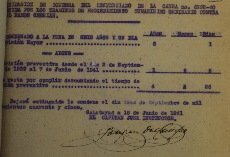 El 27 de Febrero de 1939 se especifica que la pena de reclusión perpétua eran 30 años de reclusión mayor como responsable en concepto de autor de un delito de adhesión a la rebelión, definido y sancionado en el párrafo 2º del art. 238 de l Código de Justicia Militar.