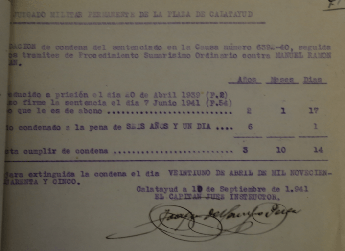 El 17 de Febrero de 1952 solicita una copia de la sentencia para poder reingresar en RENFE de la que fue expulsado en los primeros aciagos días. En ese momento ya residía en la calle de la Higuera 2, 2º Derecha de Zaragoza.