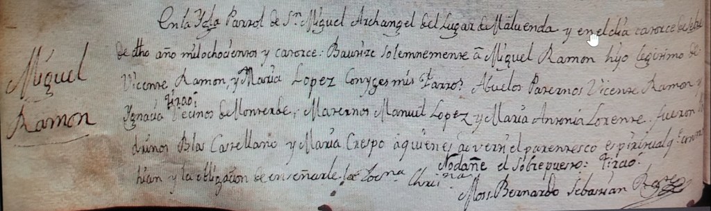 En la Iglesia Parroquial de San Miguel Archangel de Maluenda y en el día catorce de Septiembre del año mil ochocientos y catorce, Yo Monseñor Bernardo Sebastián bautizé solemnemente a Miguel Ramón hijo legítimo de Vicente Ramón y María López, mis parroquianos. Abuelos paterno Vicente Ramón e Ignacia Tizao, vecinos de Monterde; maternos Manuel López y María Antonia Lorente. Fueron padrinos Blas Castellano y María Crespo a quienes advertí el parentesco espiritual que adquirían y la obligación de enseñarle la doctrina cristiana.
