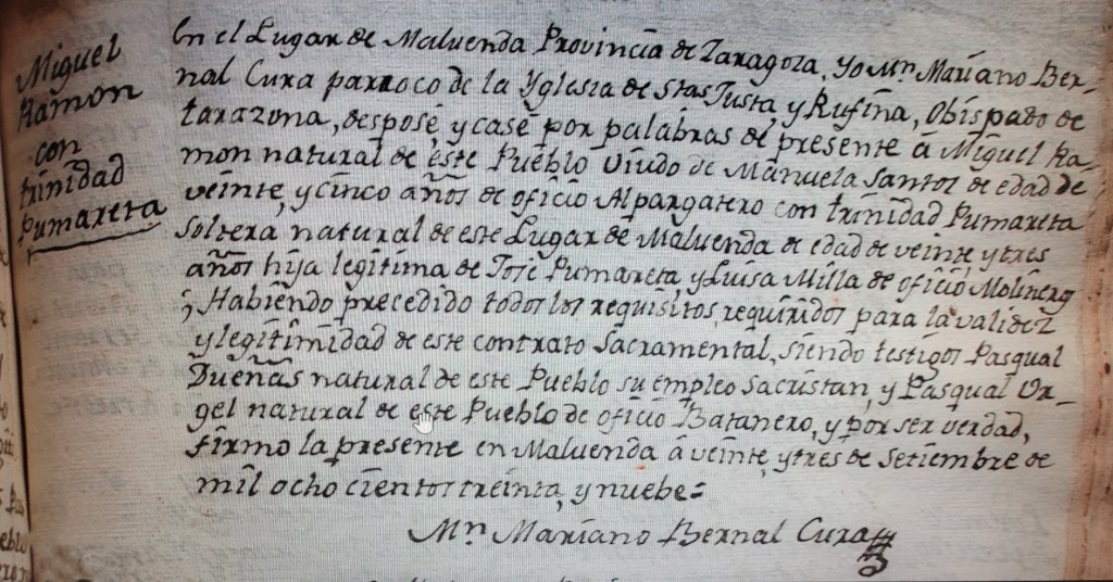 En el Lugar de Maluenda Provincia de Zaragoza, Yo Mosen Mariano Bernal Cura párroco de la Iglesia de Santas Justa y Rufina, Obispado de Tarazona, desposé y casé por palabras de presente a Miguel Ramón natural de este Pueblo, Viudo de Manuela Santos de edad, de veinte y cinco años de oficio Alpargatero con Trinidad Pumareta, Soltera natural de este Lugar de Maluenda de edad de veinte y tres años, hija legítima de José Pumareta y Luisa Milla de oficio Molinera; habiendo precedido todos los requisitos requeridos para la validez y legitimidad de este Contrato Sacramental, siendo testigos Pasqual Dueñas natural de este Pueblo de oficio Batanero y por ser verdad firmo la presente en Maluenda a veinte y tres de Setiembre de mil ochocientos treinta y nuebe.
