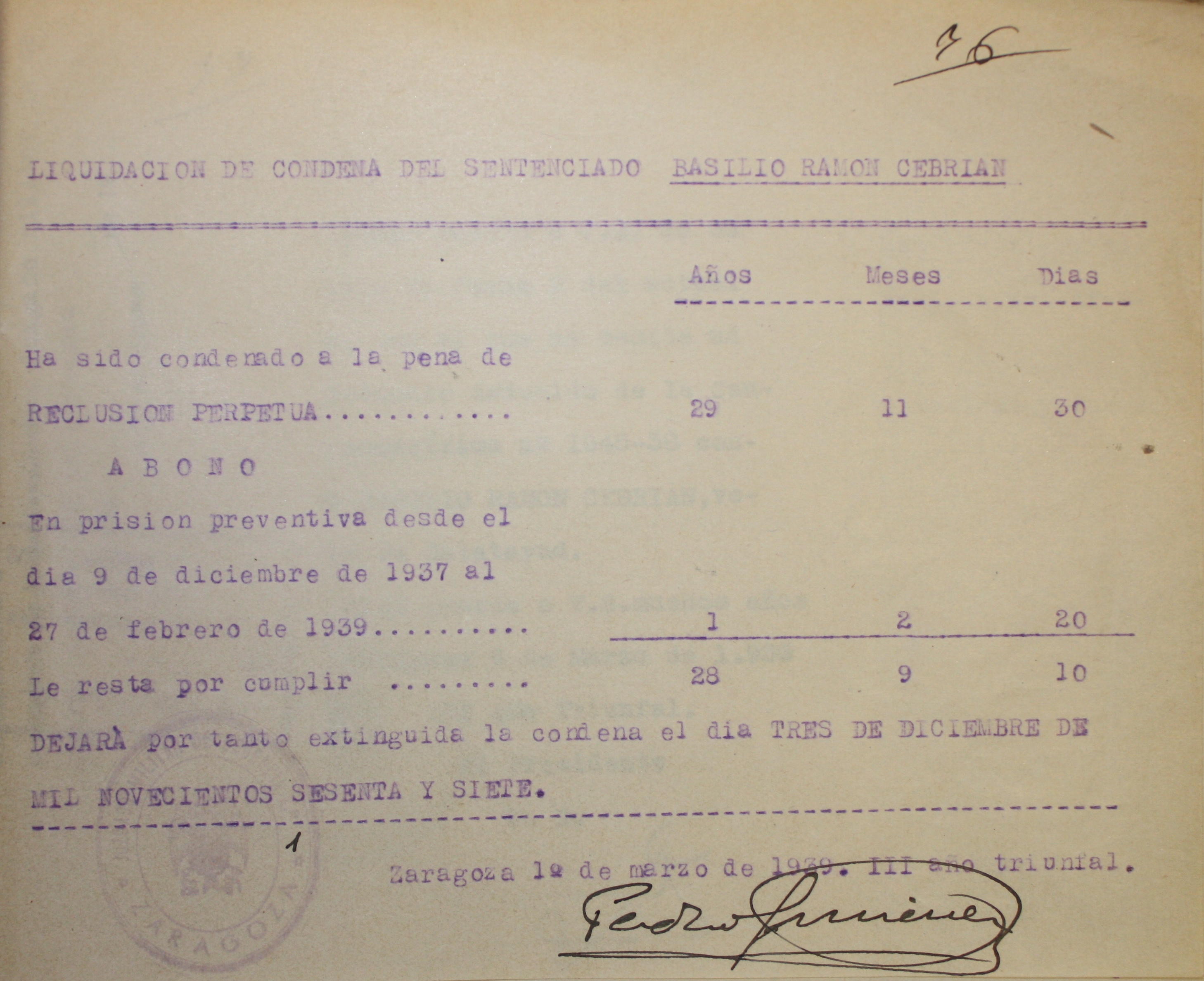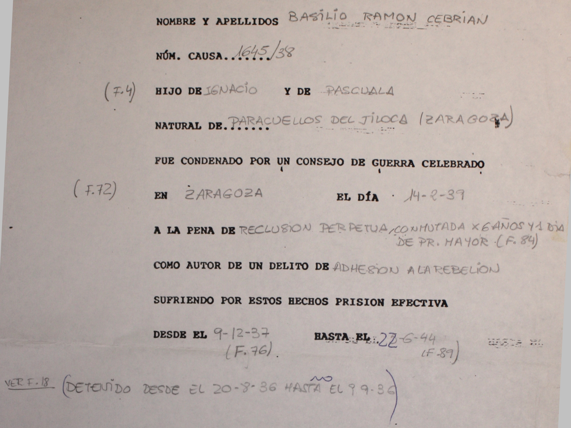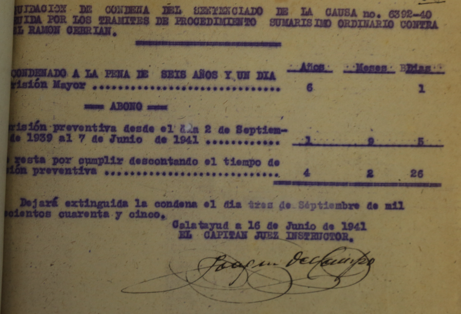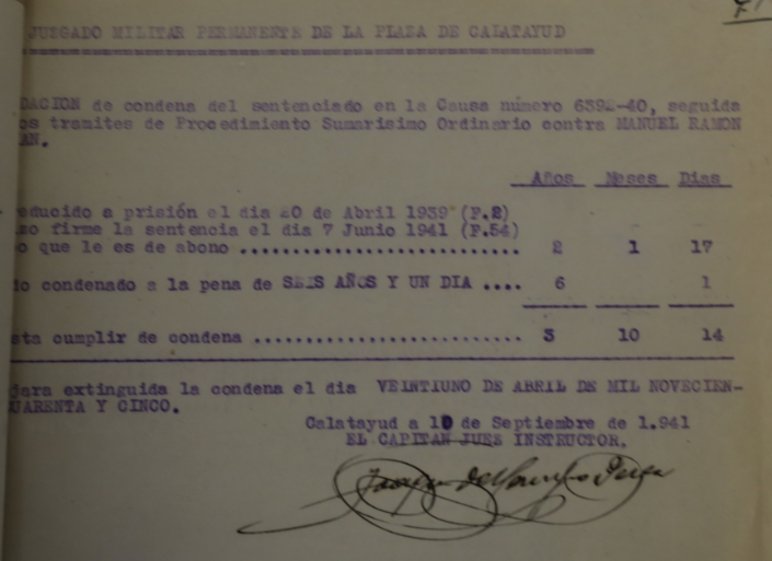 El 27 de Febrero de 1939 se especifica que la pena de reclusión perpétua eran 30 años de reclusión mayor como responsable en concepto de autor de un delito de adhesión a la rebelión, definido y sancionado en el párrafo 2º del art. 238 de l Código de Justicia Militar.