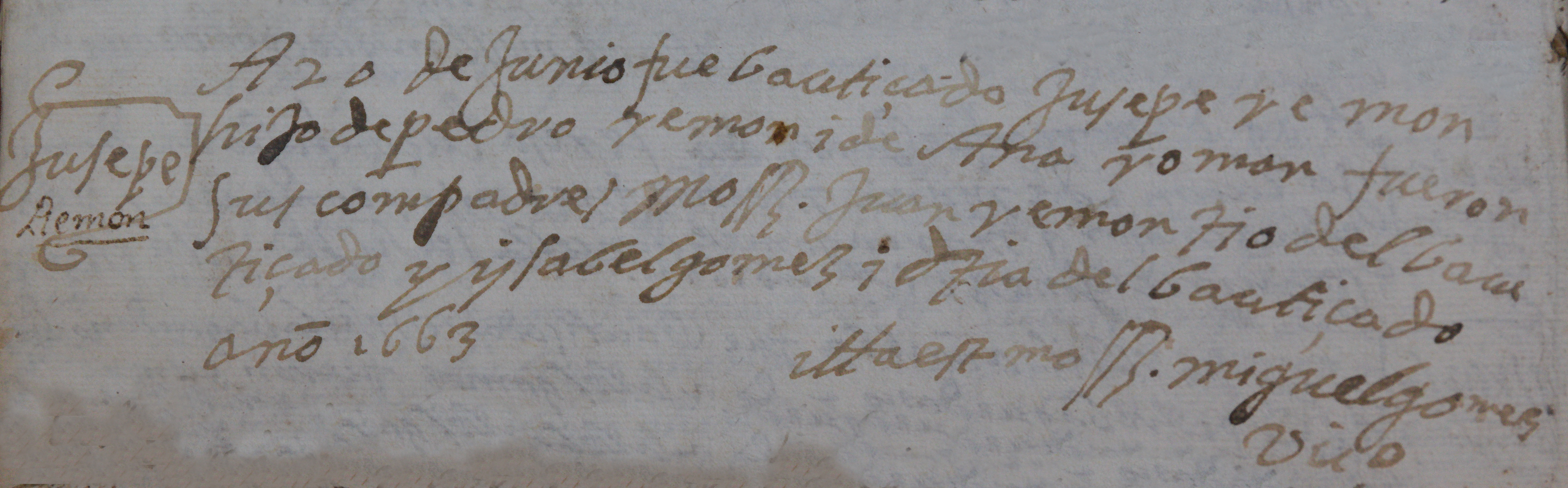 A 20 de Junio fue bautizado Jusepe Ramón hijo de Pedro Ramón y de Ana Román fueron sus compadres Mossen Juan Ramon tío del bautiçado y Isabel Gomez tía del bautiçado