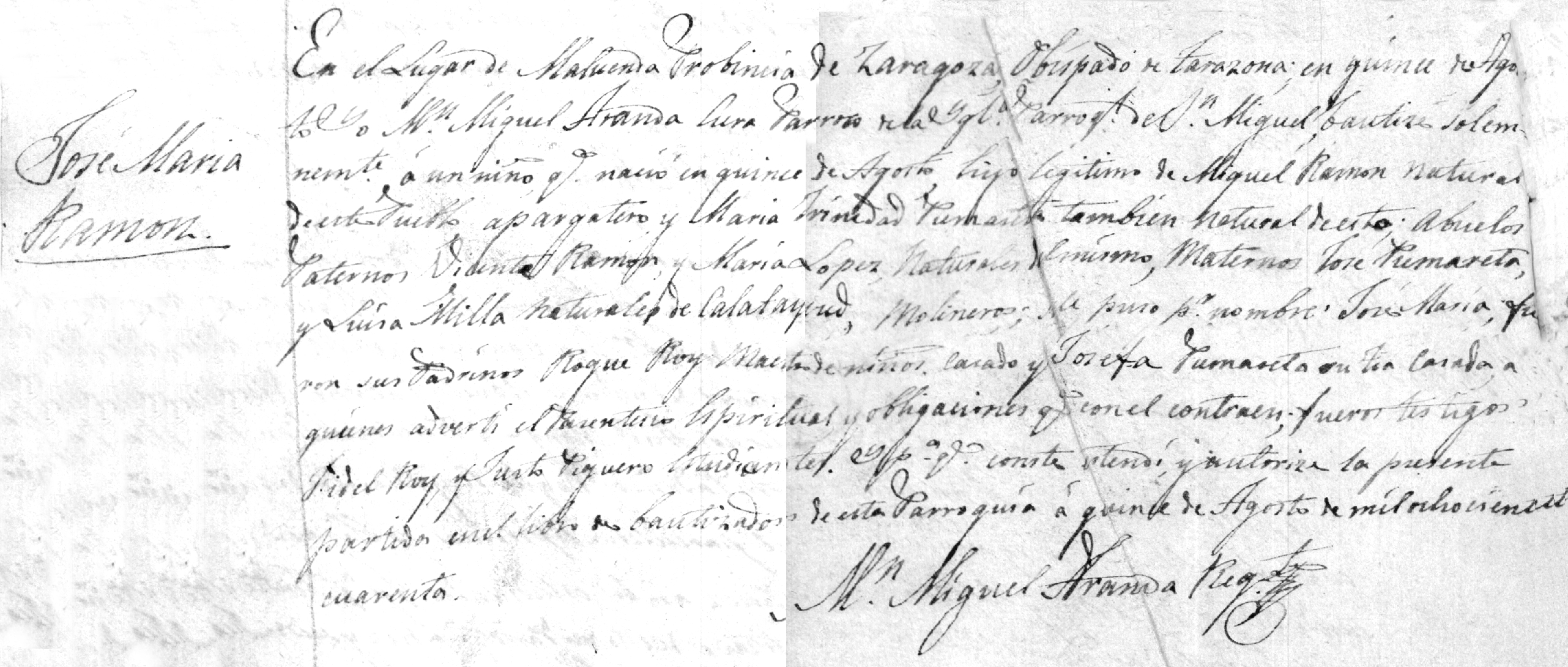 En el Lugar de Maluenda Provincia de Zaragoza, Obispado de Tarazona, en quince de Agosto, Yo Mosén Miguel Aranda Cura Párroco de la Iglesia Parroquial de San Miguel bautizé solemnemente a un niño que nació en quince de Agosto hijo legítimo de Miguel Ramón natural de este pueblo alpargatero y María Trinidad Pumareta también natural de este. Abuelos Paternos Vicente Ramón y María López, naturales del mismo; Maternos José Pumareta y Luisa Milla natural de Calatayud, molineros; le puse por nombre José María; Fueron sus padrinos Roque Royo, Maestro de niños, casado y Josefa Pumareta, su tía casada a quienes advertí el Parentesco Espiritual que con él contraen; fueron sus hijos Fidel Royo y Justo Piquero estudiantes. Para que conste …. y autoriza la presente en el libro de Bautismo de esta Parroquia a quince de Agosto de mil ochocientos cuarenta.