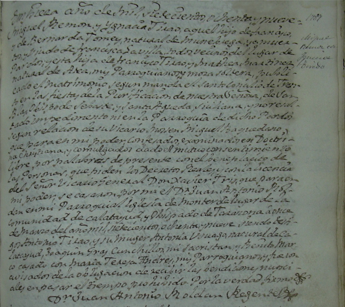 Miguel Ramón y Ignacia Tizao, aquel hijo de Francisco y de Bernarda Tomey, natural de Munébrega, ya muertos y viudo de Francisca Savilla, todos vecinos del lugar de Pardos; y esta hija de Francisco Tizao y Francisca Martínez natural de Ateca, mis Parroquianos y moza soltera, publicado el matrimonio según manda el santo concilio de Trento en las fiestas de la Purificación de nuestra Señora, de San Blas Obispo de Sebaste y Santa Agueda Siciliana, y no resultado impedimento ni en la Parroquia de dicho Pardos según relación de su Vicario Mosen Miguel Baquedano, que para mi poder confesados, examinados en doctrina Christiana, y comulgados dado el mutuo consentimiento libre, por palabras de presente con el beneplácito de las Personas, que piden los Decretos Reales y con la licencia del Señor Vicario General Don Xavier Tris, que para en mi poder, se casaron por mi Mosen D. Juan Antonio Roldan en mi Parroquial Iglesia de Monterde lugar de la comunidad de Calatayud, u Obispado de Tarazona once de marzo del año mil sietecientos ochenta y nueve siendo testigos Antonio Tizao y su mujer Antonia Vinuesa natural de Calatayud, Joaquín Gray Cunchillos mi sacristán y Benito Marco casado con María Teresa Andrés, mis Parroquianos y fueron avisados de la obligación de recibir las bendiciones nupciales en pasar el tiempo prohibido. Por la verdad firmo