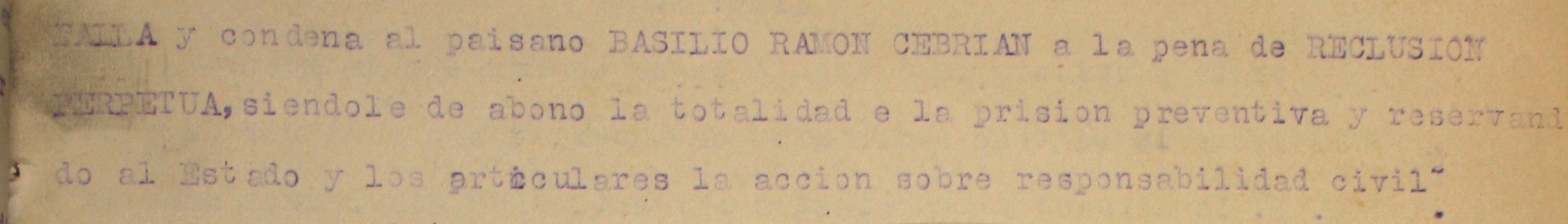 FALLA y condena al paisano BASILIO RAMON CEBRIAN a la pena de RECLUSION PERPETUA, siéndole de abono la totalidad de la prisión preventiva y reservando al Estado y los particulares la acción sobre responsabilidad civil.