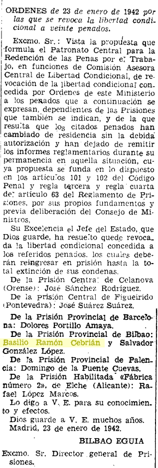 Por ejemplo, según el expediente militar al que tuve acceso mi abuelo figuraba como ingresado en la Prisión Provincial de Bilbao en el año 1941 pero sorprendentemente en el B.O.E. de 7 de Febrero de 1942 aparece una disposición en la que se revoca la prisión condicional a veinte penados (entre los que se encuentra Basilio) por haber cambiado de residencia sin haber informado a la autoridad militar.