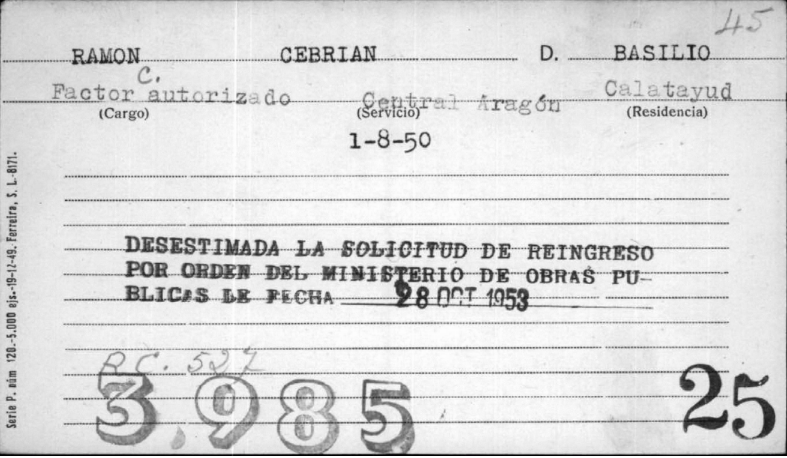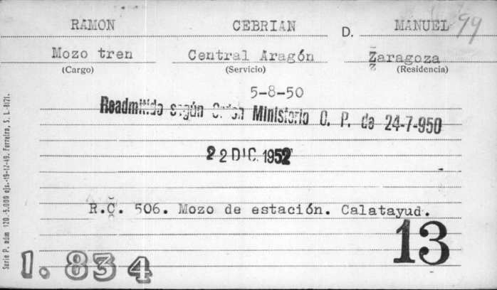 El 17 de Febrero de 1952 solicita una copia de la sentencia para poder reingresar en RENFE de la que fue expulsado en los primeros aciagos días. En ese momento ya residía en la calle de la Higuera 2, 2º Derecha de Zaragoza.