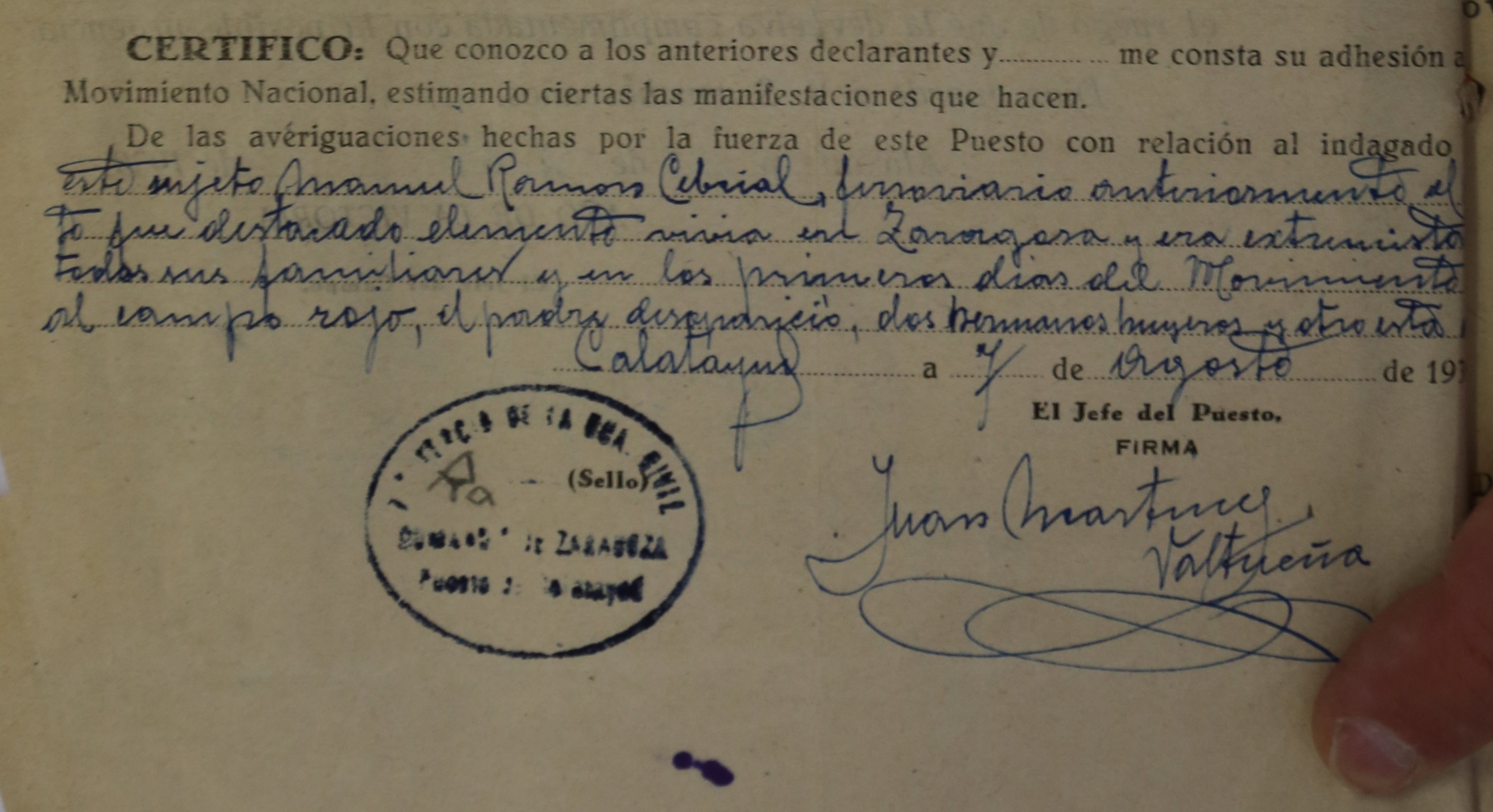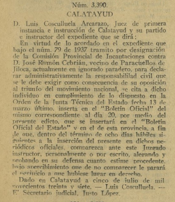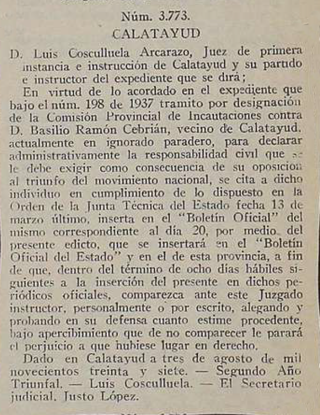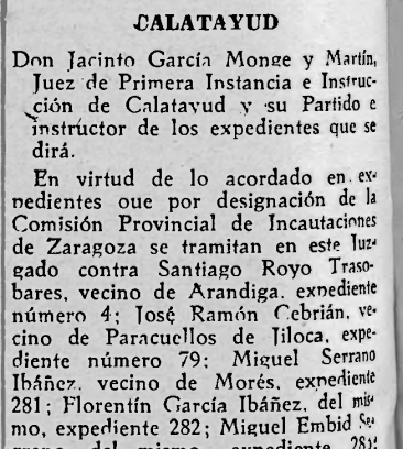 En el Boletín Oficial de la Provincia de Zaragoza (número 187 ) de fecha 10 de Agosto de 1937, en la página 437 puede verse en la Sección Séptima la siguiente entrada